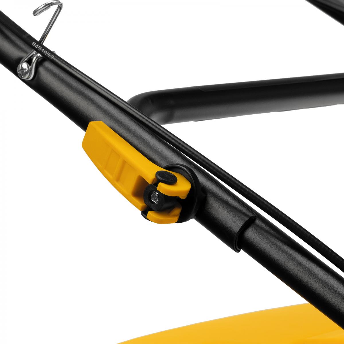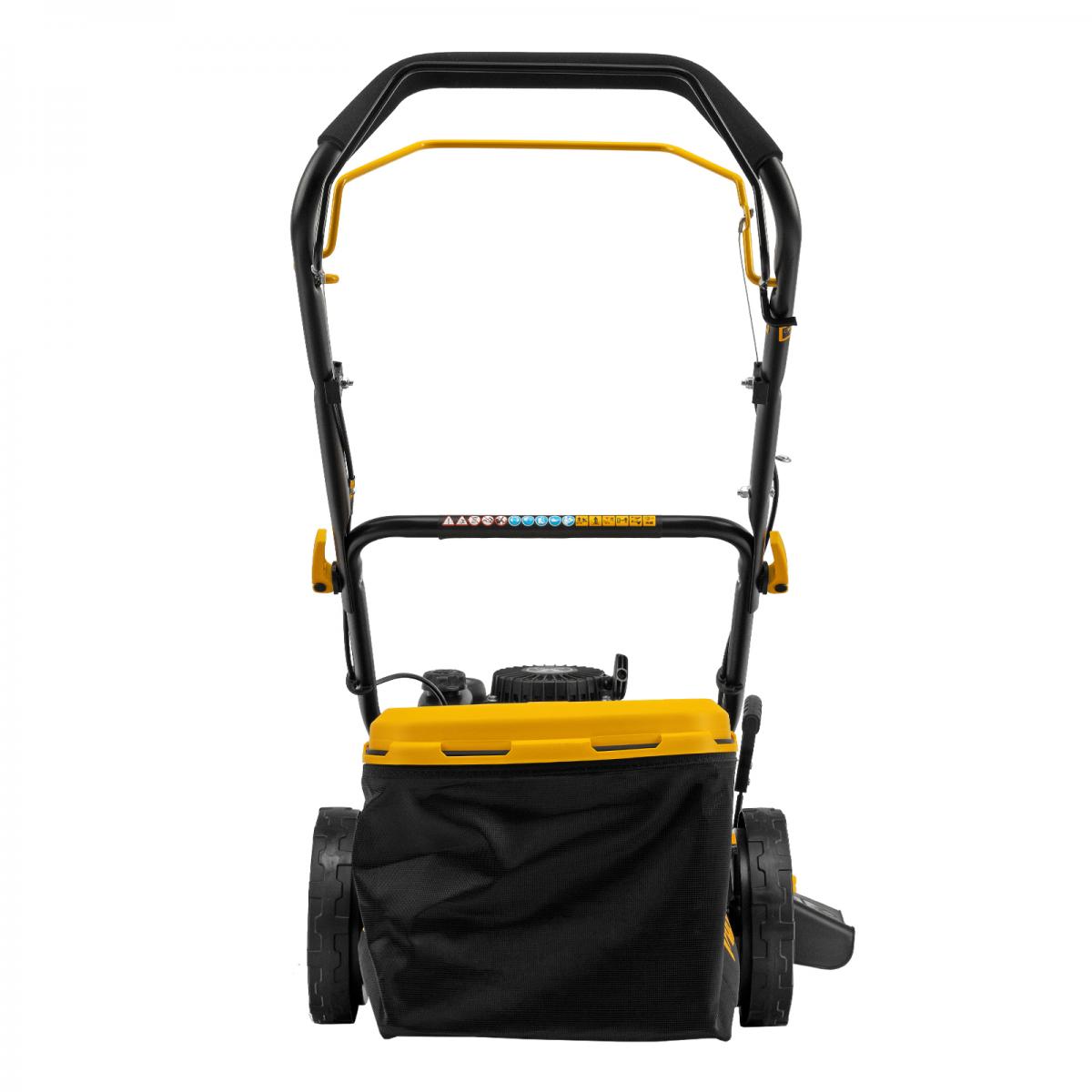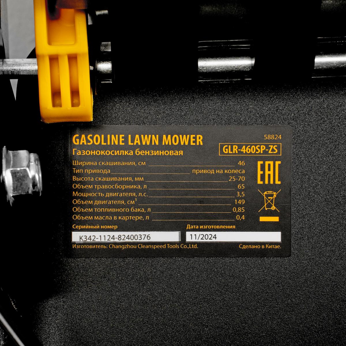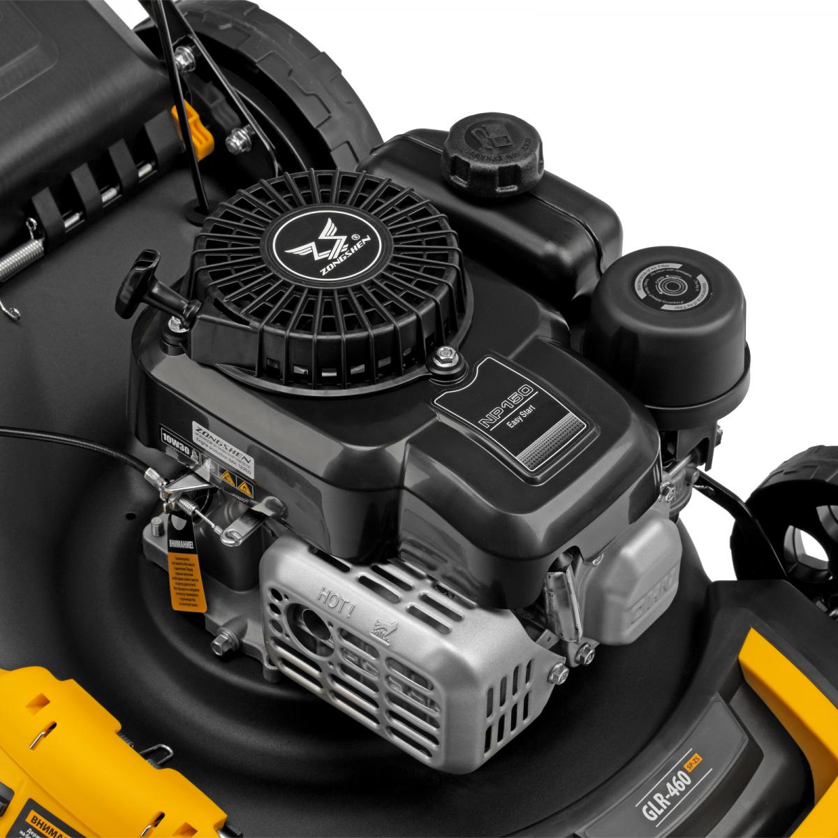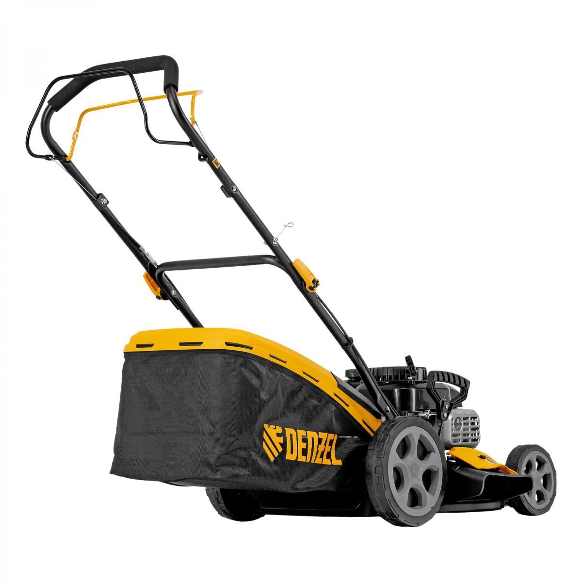 Бензиновая газонокосилка Denzel GLR-460SP-ZS 58824 с приводом на колеса и травосборником вместимостью 65 л, с надежным и экономичным 4-тактным двигателем объемом 149 см3, обеспечивает ширину прохода 46 см. Предназначена для стрижки газонов и скашивания травы в саду, будет полезна для ухода за дачным участком или придомовой территорией. Высота скашивания легко регулируется одним рычагом в диапазоне 25-70 мм (предусмотрено 8 уровней). ПреимуществаШирокий функционал «4 в 1» — газонокосилка работает в режимах сбора травы в объемный контейнер, мульчирования, бокового выброса, а также выброса травы под деку.Функция мульчирования — срезанная трава мелко измельчается и распределяется по поверхности газона для его удобрения.Опция бокового выброса — во время обработки большого участка не нужно прерываться для опустошения травосборника, а равномерно разложенная трава подходит для заготовки сена.Привод на колеса — можно с легкостью направлять газонокосилку, не толкая ее.Оптимизированная геометрия