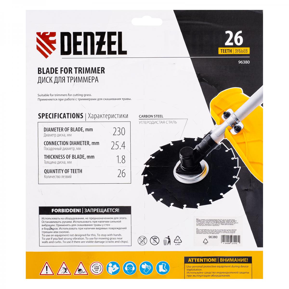 Диск для триммера Denzel 96380 с внешним диаметром 230 мм и посадочным — 25,4 мм, с 26 зубьями долотообразной формы, предназначен для скашивания травы и мелкого кустарника. Устанавливается на вал триммера с бензиновым двигателем. Диск пригодится для ухода за дачным участком.ПреимуществаУстойчивость к высоким динамическим нагрузкам — диск выполнен из прочной углеродистой стали толщиной 1,8 мм.Агрессивная форма зубьев — благодаря уникальной форме режущей кромки зуба диск особенно эффективен при срезании побегов кустарника и молодых деревьев.Эффективная расчистка территории — острые зубья быстро срезают растительность.