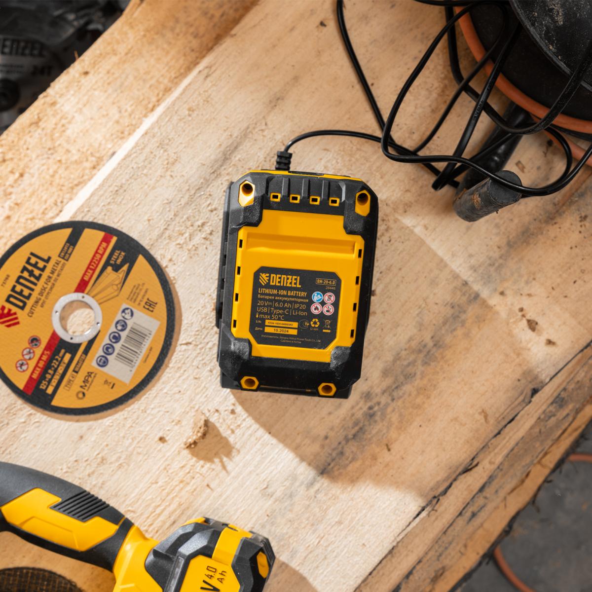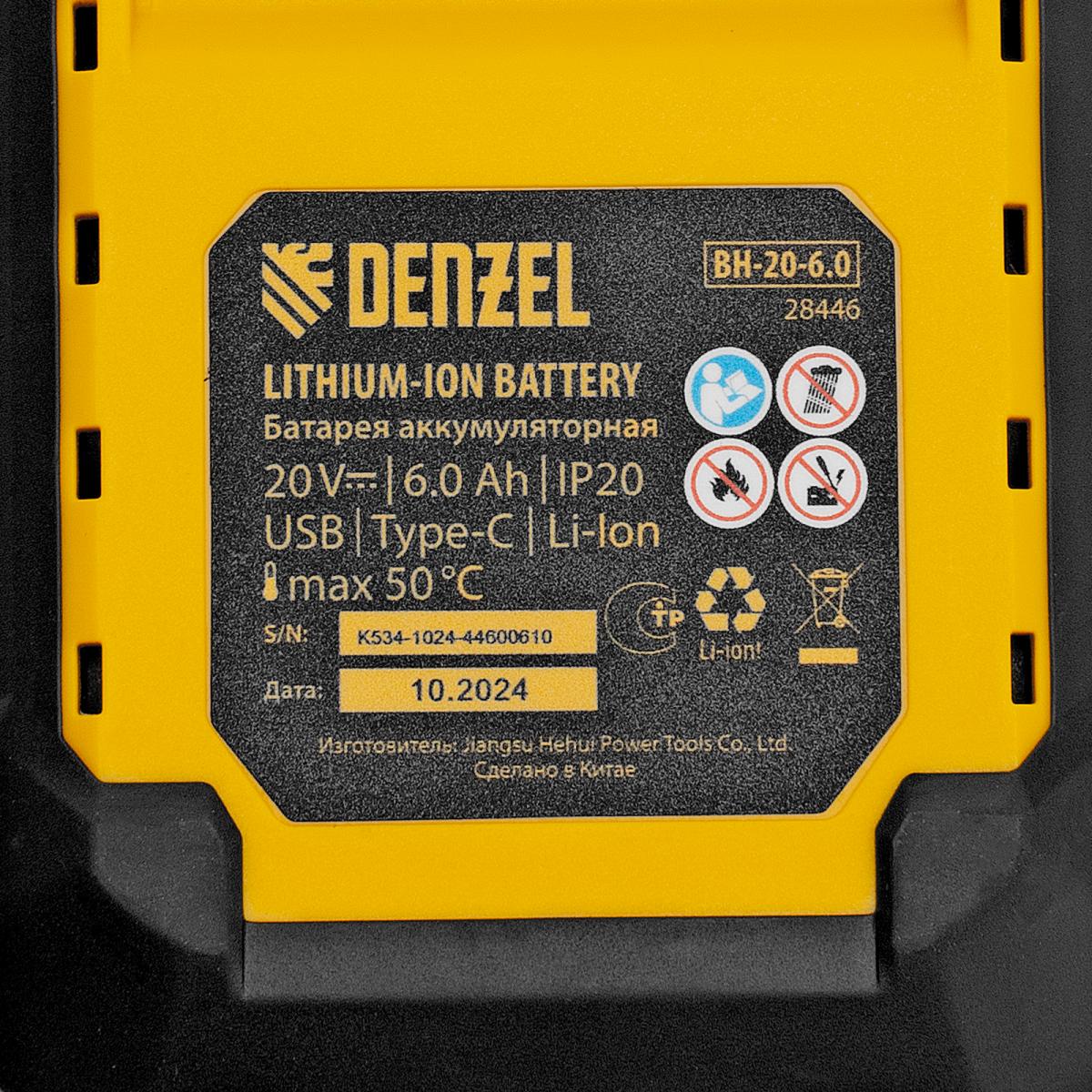 Батарея аккумуляторная BH-20-6.0, Li-Ion, USB, 20 В, 6,0 Ач// Denzel