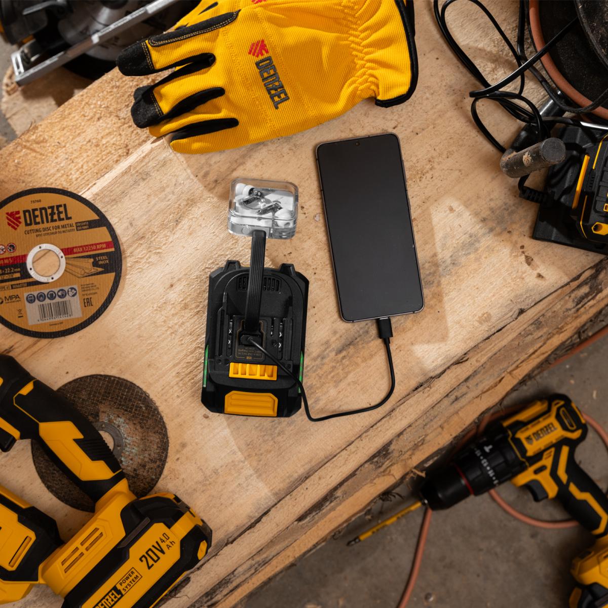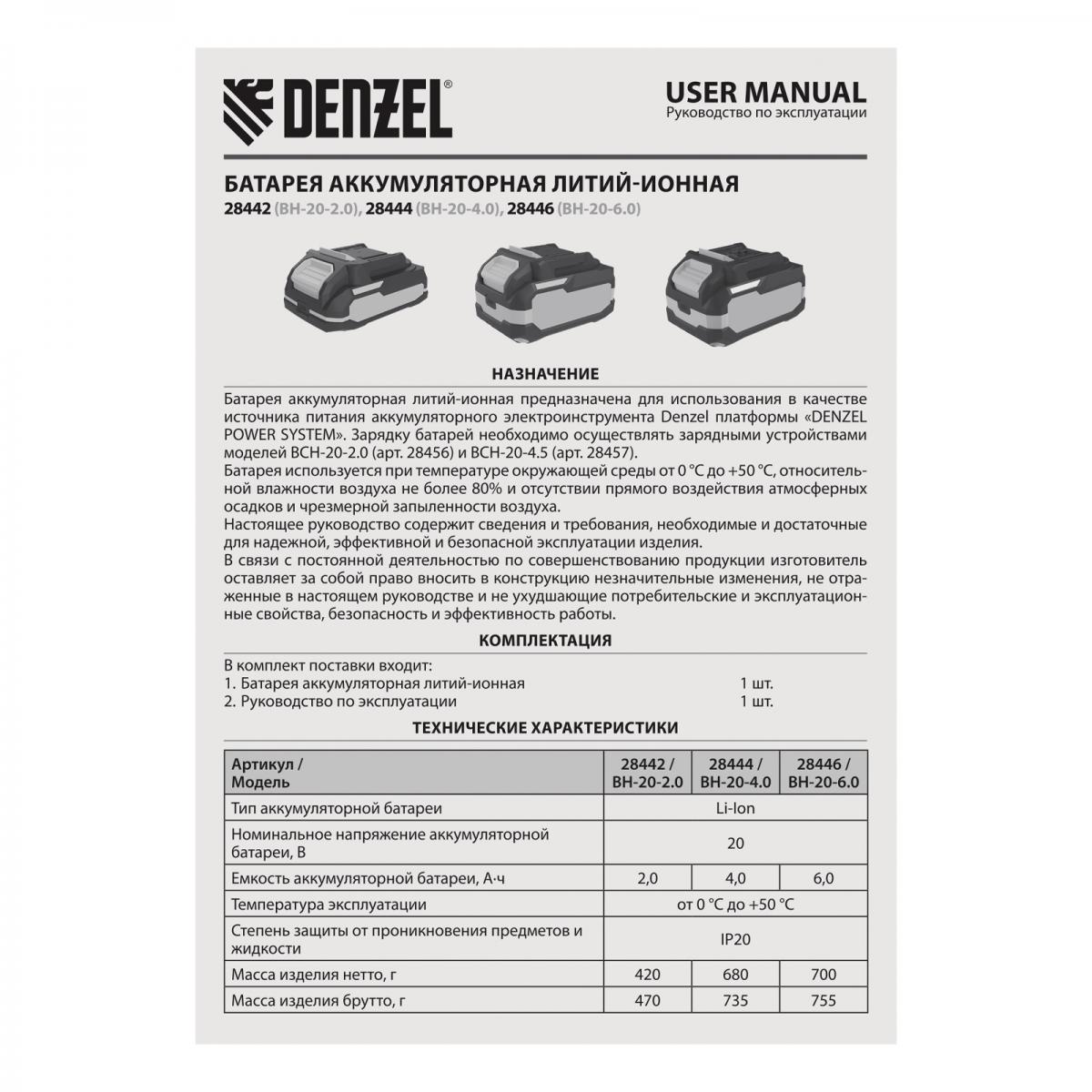 Батарея Li-Ion Denzel BH-20-6.0 28446 номинальным напряжением 20 В и емкостью 6,0 А·ч обеспечивает работоспособность аккумуляторного инструмента. Подходит для всех инструментов единой платформы Denzel Power System 20V. Также может использоваться в качестве зарядного устройства для мобильных устройств, поддерживающих зарядку от разъемов USB 3.0 (USB-A) и USB Type-C.ПреимуществаОтсутствие эффекта памяти — батарея полностью сохраняет рабочие свойства в течение всего срока использования.Удобное использование — аккумулятор можно подзаряжать, при этом не происходит снижения емкости.Защита от перегрузок — при превышении допустимого значения силы тока аккумулятор отключается для предотвращения поломки.Защита от глубокого разряда и перезаряда — автоматический контроллер своевременно отключает нагрузку, исключая выход аккумулятора из строя.Контроль уровня заряда — на боковых поверхностях предусмотрены индикаторы, позволяющие оценить оставшееся время работы.