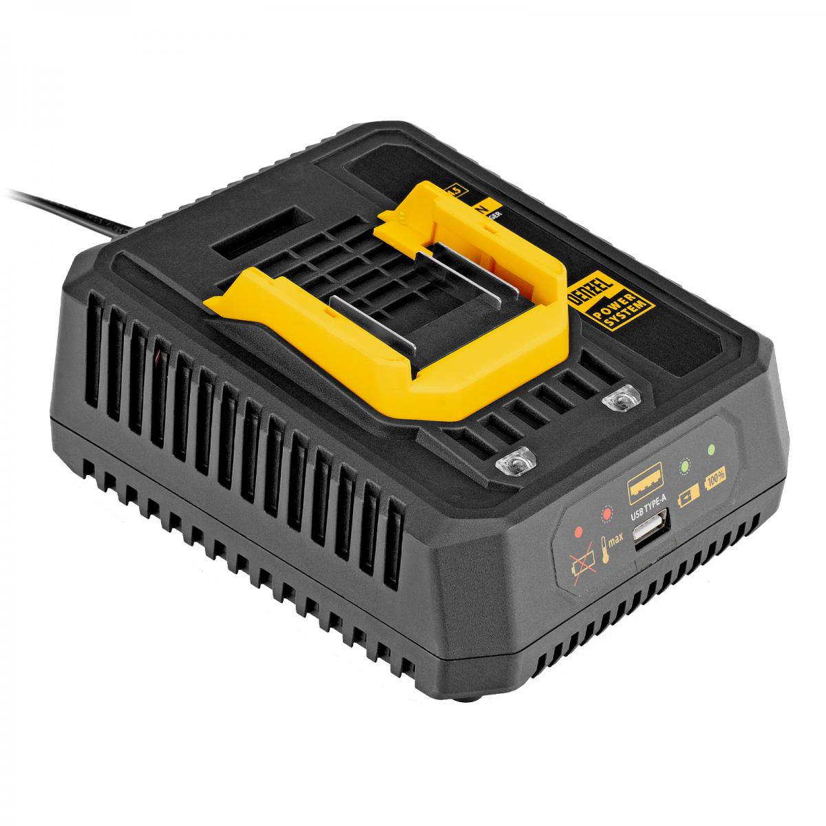 Зарядное устройство Denzel BCH-20-4.5 28457 предназначено для восстановления работоспособности Li-Ion аккумуляторов единой платформы Denzel Power System 20 V (артикулы 28442, 28444 и 28446). Поддерживает ток заряда 4,5 A. Обеспечивает ускоренную и полную зарядку, что позволяет быстро вернуться к работе с аккумуляторным инструментом. Длина кабеля составляет 1,2 м, поэтому зарядное устройство удобно подключать к розетке.ПреимуществаУдобный контроль работы — красный индикатор означает, что идет процесс зарядки, зеленый указывает на то, что зарядка завершена.Безопасное использование — усиленная изоляция предотвращает получение электротравмы.Надежность — система защиты от перегрузки обеспечивает работу без риска поломки.Защита от перегрева — производитель предусмотрел систему охлаждения ЗУ, если же допустимая температура зарядного устройства или батареи все-таки будет превышена, индикатор начнет мигать красным, в этом случае необходимо прервать зарядку до их остывания.Использование в качест