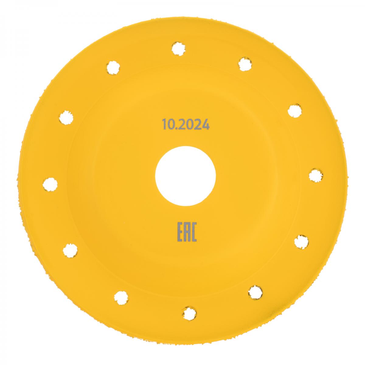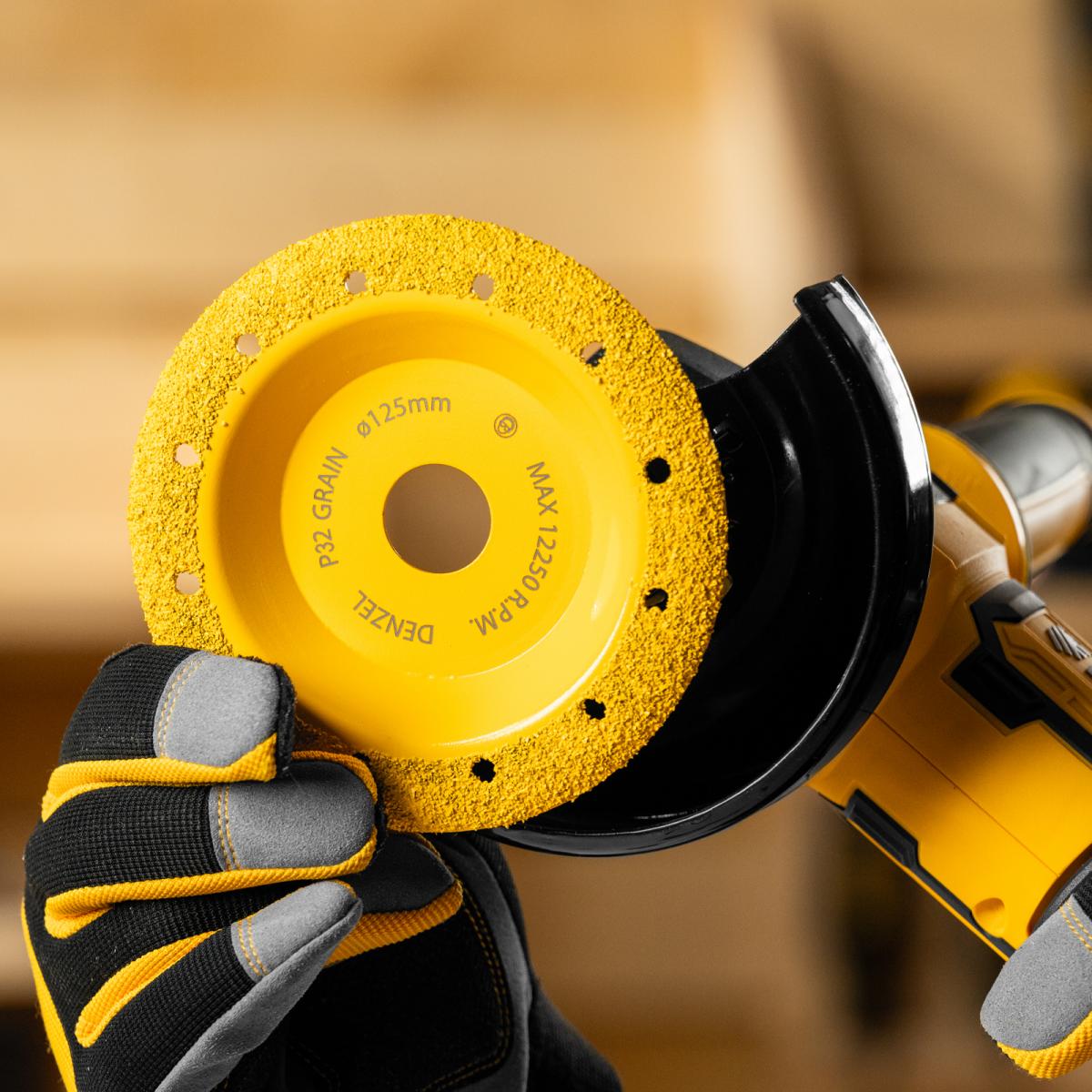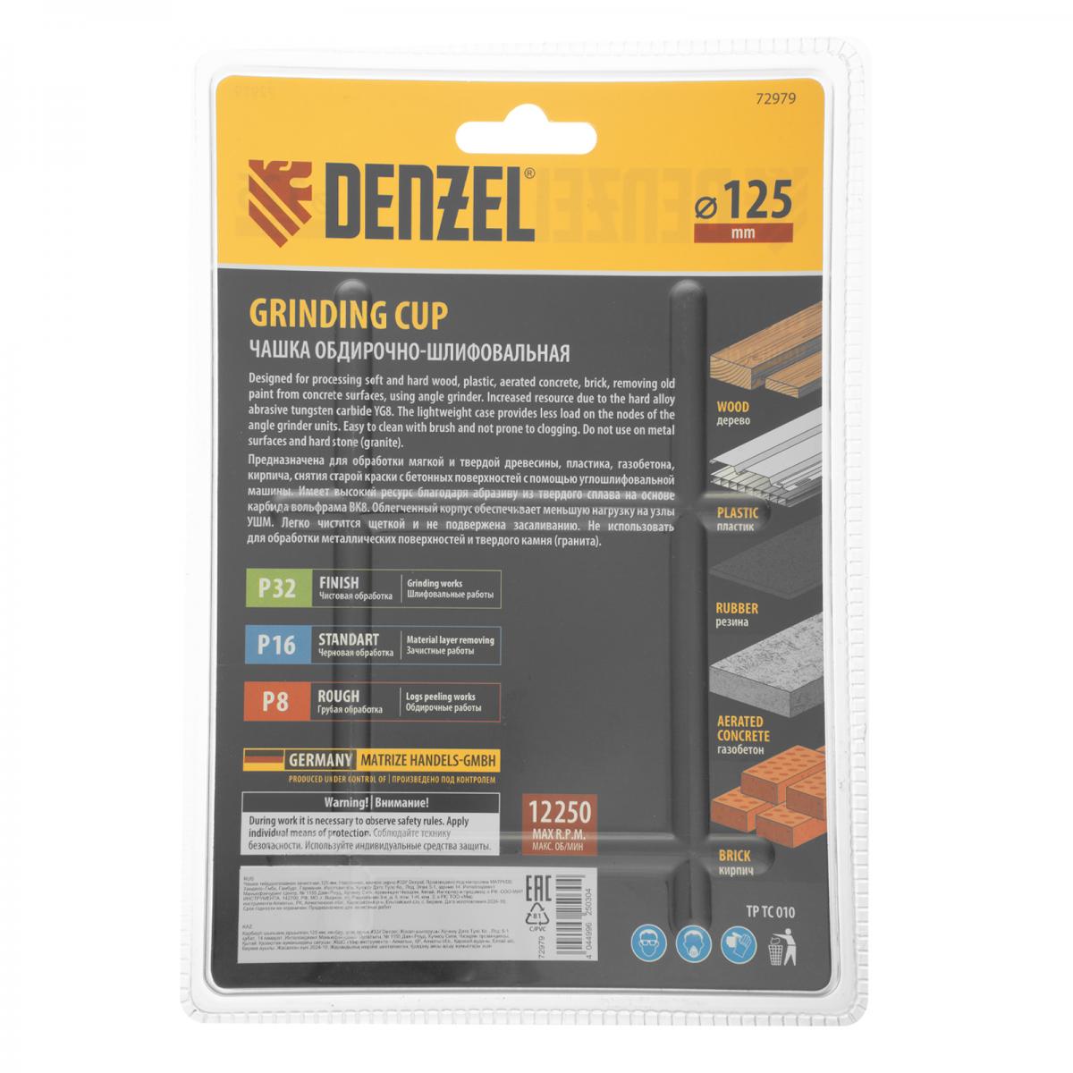 Твердосплавная зачистная чашка Denzel 72979 диаметром 125 мм, с наклонной рабочей частью и мелким зерном P32, используется для проведения шлифовальных работ при помощи углошлифовальной машины (УШМ). Мелкозернистый абразив оптимален для чистовой обработки твердой и мягкой древесины, кирпича, пластика, резины, газобетона. С помощью чашки можно устранить мелкие неровности, остатки старого покрытия, подготовить поверхности к дальнейшей отделке. Режущие частицы из твердого сплава ВК8 не образуют абразивную пыль, что снижает вредное воздействие на здоровье пользователя. Оснастка пригодится при проведении строительных, ремонтных и отделочных работ.