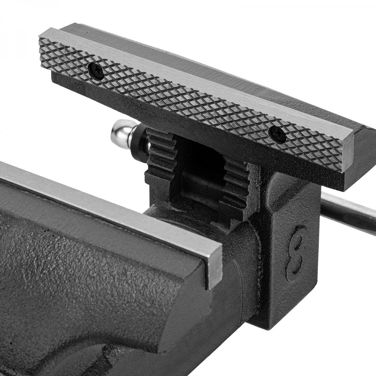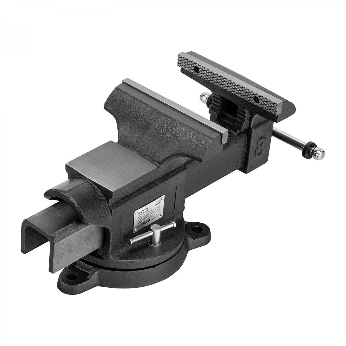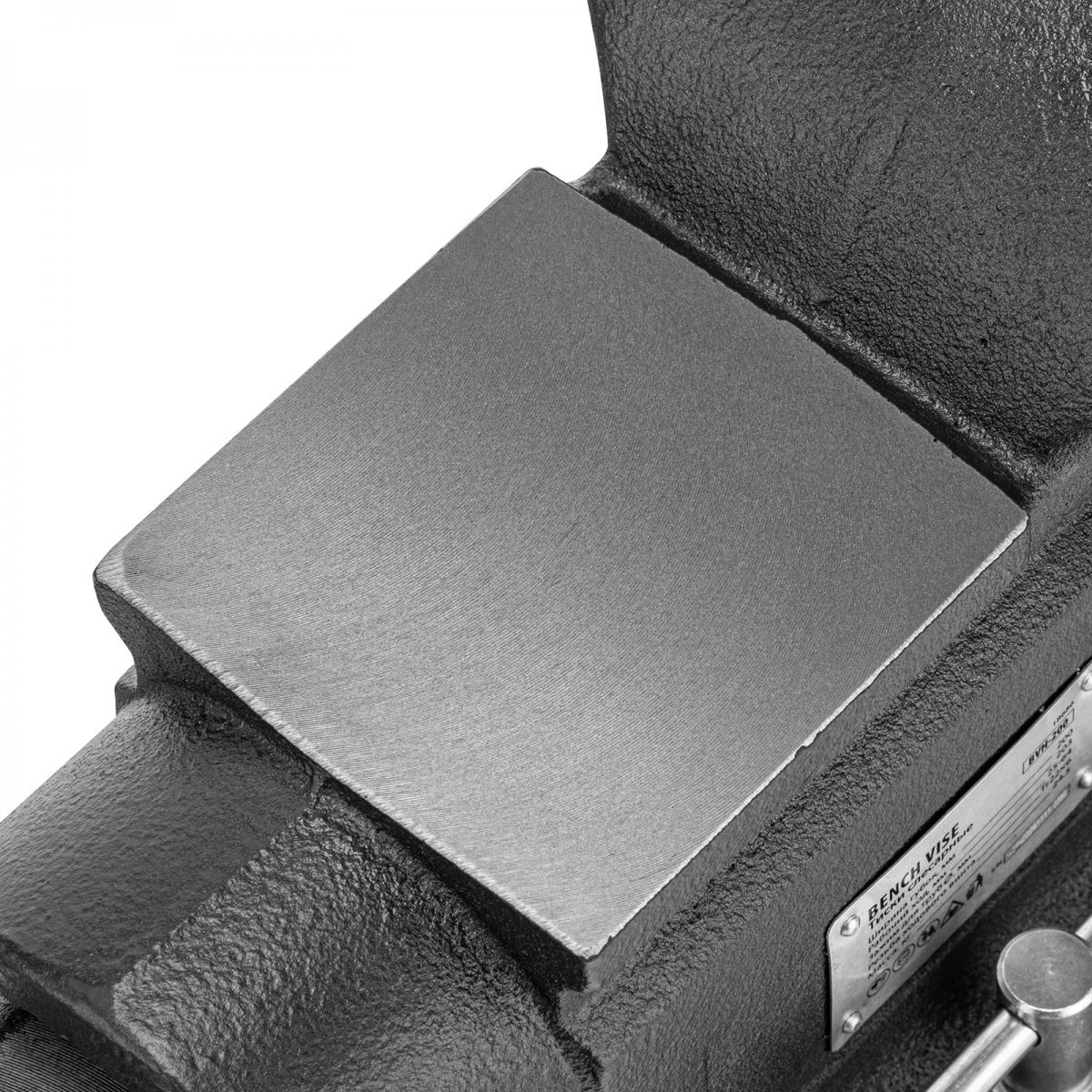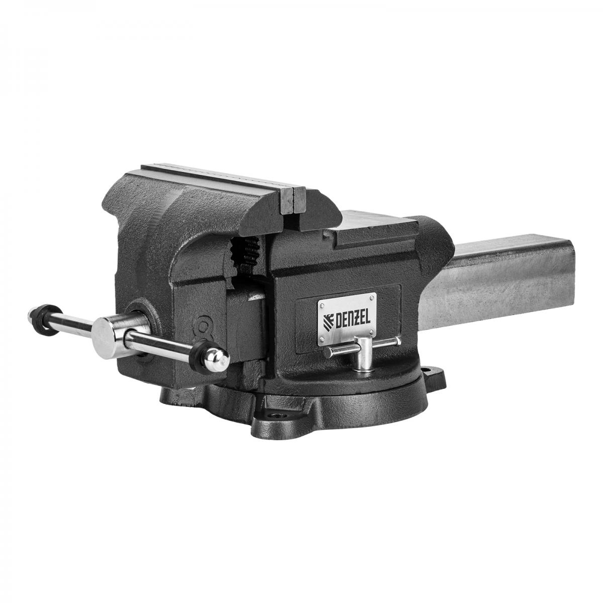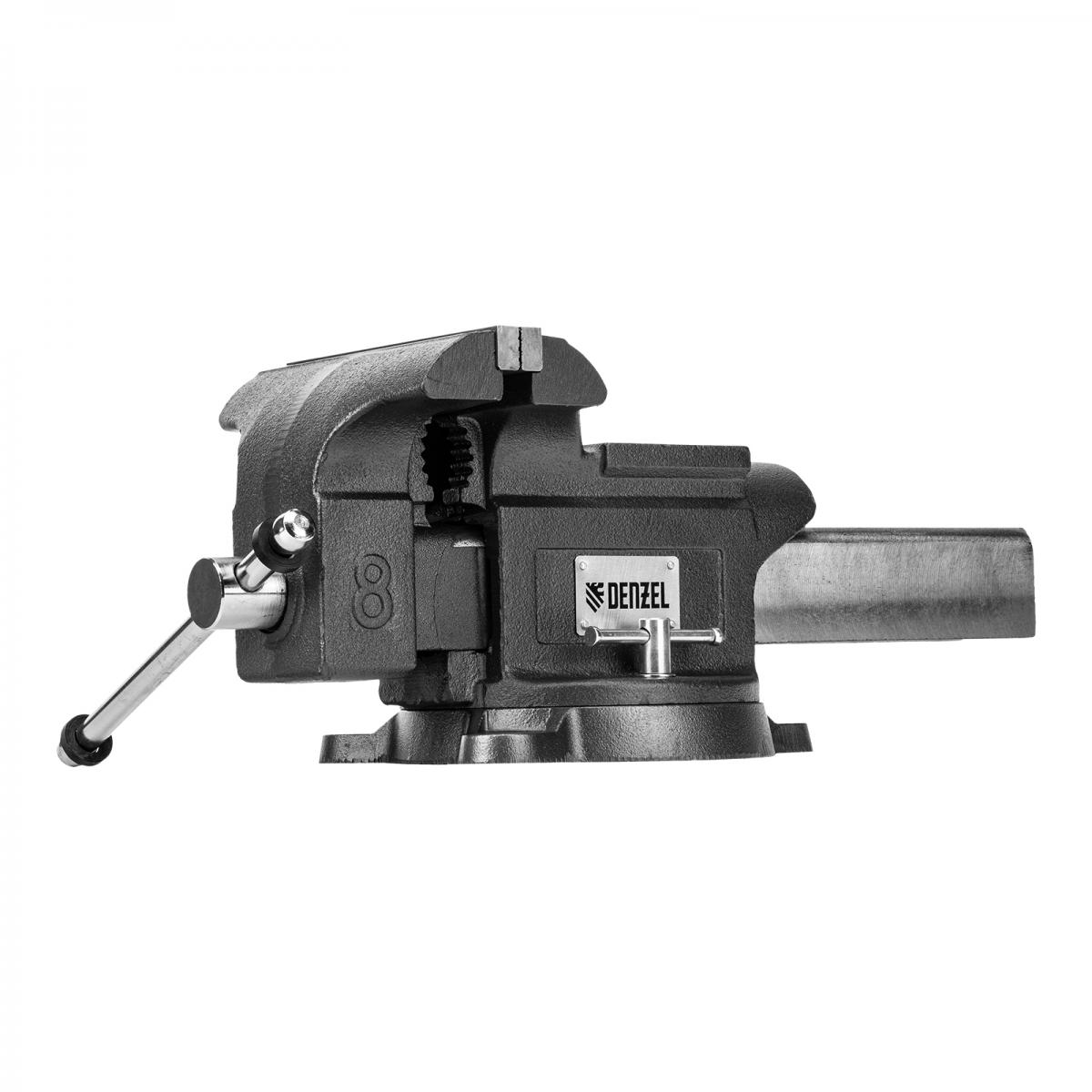 Слесарные поворотные тиски Denzel BVH-200 18686 с губками шириной 200 мм и стальной направляющей предназначены для фиксации деталей и заготовок, а также для выполнения мелких ударных работ — в конструкции предусмотрена наковальня. Рабочий ход составляет 200 мм, глубина зажима — 90 мм. Специальный зажим позволяет фиксировать трубы диаметром 25-64 мм, что расширяет возможности использования инструмента. На губки можно установить защитные накладки (приобретаются отдельно) для предотвращения повреждения зажимаемых предметов. Тиски пригодятся в мастерской и гараже.
