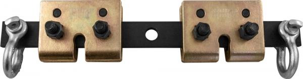**Описание** Зажим для кузовных работ два направления, усилие 5 тонн. Специальный зажим с переставными захватами и ушками, созданный для передачи тягового усилия и установки автомобиля на стапеле с удержанием, в первую очередь да шов порогов автомобиля. Допустимое прилагаемое тяговое усилие составляет 5 тонн. **Область применения** Применяется при проведении стапельного кузовного ремонта.