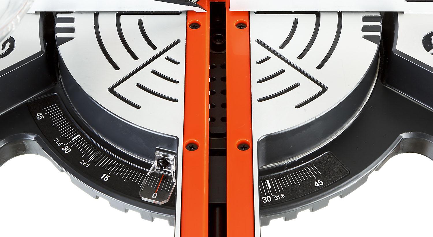 - Фиксирующийся в любом положении поворотный стол и удобная регулировка наклона облегчают установку угла пиления