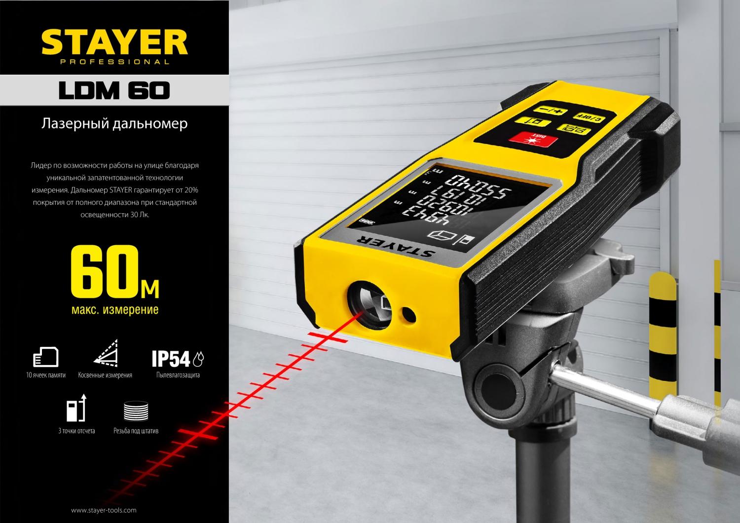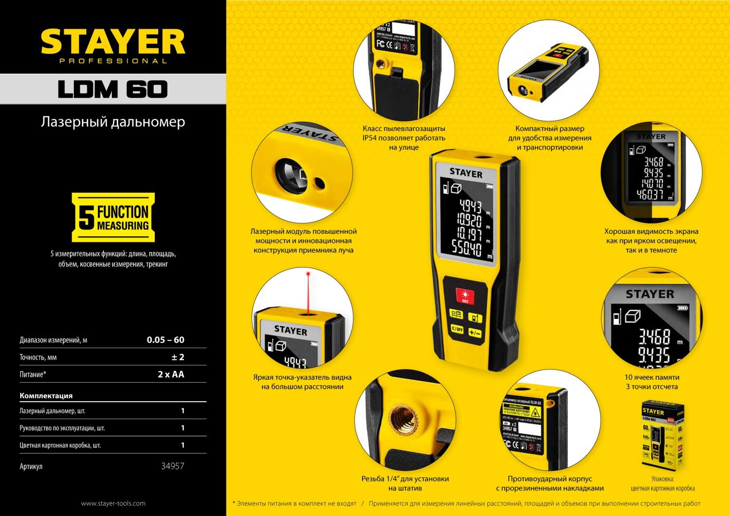 Лазерный дальномер Stayer LDM50 – это высокоточный прибор для быстрого и простого измерения линейных расстояний, площадей и объёмов. Позволяет проводить весь цикл измерений одному человеку, значительно ускоряя выполнение разметочных работ и повышая точность полученных данных.