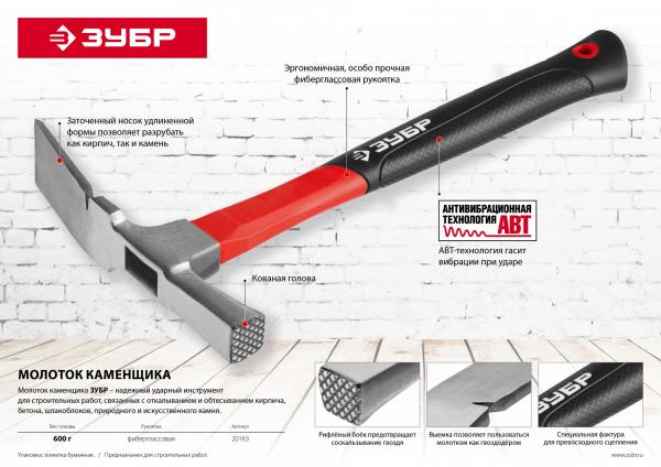 Молоток ЗУБР ПРОФЕССИОНАЛ оснащен особопрочной фибергласовой рукояткой. АВТ - технология позволяет существенно снизить вибрации, возникающие во время удара, что делает работу с инструментом более комфортной. Соответствует требованиям ГОСТ 11042-90.