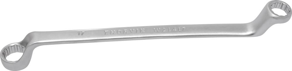 **Описание** Ключи гаечные кольцевые двусторонние коленчатые, более известные потребителям как накидные или просто кольцевые ключи – гаечные ключи, имеющие округлую форму рабочей части, что позволяет при проведении работ по откручиванию или закручиванию охватывать крепежное соединение со всех сторон. Тем самым, накидные ключи незаменимы при работе с тугими крепежными соединениями, позволяют за счет своей формы прилагать большие усилия, чем при работе с рожковыми ключами, имеющими только две грани контакта с гайкой или болтом, что и обуславливает популярность и востребованность кольцевых ключей на рынке. **Область применения** Применяются для работ с высоконагруженными резьбовыми соединениями. Изогнутая на 75°, коленчатая рабочая часть облегчает доступв труднодоступные места. Ключи изготавливаются из легированной хромованадиевой стали по стандарту DIN 838, в соотвествии с ГОСТ 2906-80. **Размеры**  | Артикул | Размер | B1, мм | В2, мм | L, мм | | --- | --- | --- | --- | --- | | Артикул | Размер | B1, мм | В2, мм | L, мм | | --- | --- | --- | --- | --- | | W21417 | 14х17 | 29,9 | 35,5 | 204,4 |