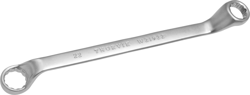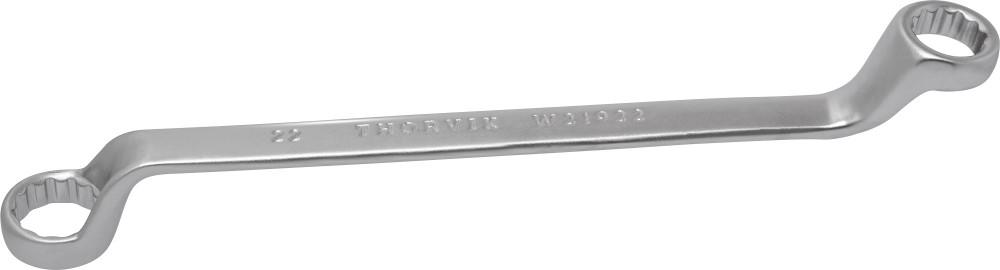 **Описание** Ключи гаечные кольцевые двусторонние коленчатые, более известные потребителям как накидные или просто кольцевые ключи – гаечные ключи, имеющие округлую форму рабочей части, что позволяет при проведении работ по откручиванию или закручиванию охватывать крепежное соединение со всех сторон. Тем самым, накидные ключи незаменимы при работе с тугими крепежными соединениями, позволяют за счет своей формы прилагать большие усилия, чем при работе с рожковыми ключами, имеющими только две грани контакта с гайкой или болтом, что и обуславливает популярность и востребованность кольцевых ключей на рынке. **Область применения** Применяются для работ с высоконагруженными резьбовыми соединениями. Изогнутая на 75°, коленчатая рабочая часть облегчает доступв труднодоступные места. Ключи изготавливаются из легированной хромованадиевой стали по стандарту DIN 838, в соотвествии с ГОСТ 2906-80. **Размеры**  | Артикул | Размер | B1, мм | В2, мм | L, мм | | --- | --- | --- | --- | --- | | Артикул | Размер | B1, мм | В2, мм | L, мм | | --- | --- | --- | --- | --- | | W21922 | 19х22 | 40,6 | 44,5 | 235,5 |
