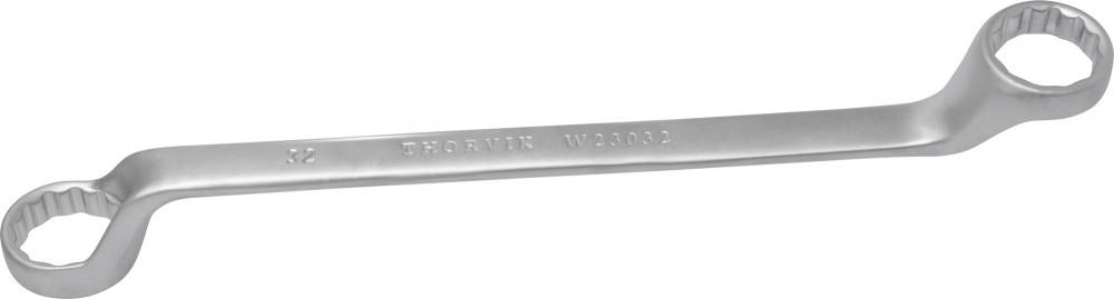 **Описание** Ключи гаечные кольцевые двусторонние коленчатые, более известные потребителям как накидные или просто кольцевые ключи – гаечные ключи, имеющие округлую форму рабочей части, что позволяет при проведении работ по откручиванию или закручиванию охватывать крепежное соединение со всех сторон. Тем самым, накидные ключи незаменимы при работе с тугими крепежными соединениями, позволяют за счет своей формы прилагать большие усилия, чем при работе с рожковыми ключами, имеющими только две грани контакта с гайкой или болтом, что и обуславливает популярность и востребованность кольцевых ключей на рынке. **Область применения** Применяются для работ с высоконагруженными резьбовыми соединениями. Изогнутая на 75°, коленчатая рабочая часть облегчает доступв труднодоступные места. Ключи изготавливаются из легированной хромованадиевой стали по стандарту DIN 838, в соотвествии с ГОСТ 2906-80. **Размеры**  | Артикул | Размер | B1, мм | В2, мм | L, мм | | --- | --- | --- | --- | --- | | Артикул | Размер | B1, мм | В2, мм | L, мм | | --- | --- | --- | --- | --- | | W23032 | 30х32 | 60,1 | 63,4 | 299,1 |