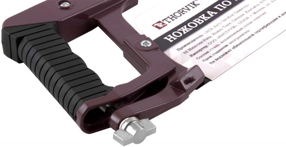 **Описание** Ножовка по металлу EXTRA, 300 мм. Прочная и легкая конструкция рамы. Эргономичная обрезиненная рукоятка. Биметаллическое режущее полотно, 24 зуба на дюйм, твердость до 64HRc. Верхняя часть рамы может использоваться для хранения запасных полотен. Возможность установки режущего полотна под углом 45° или 90°.
